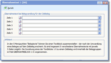 Mit den Menüfunktionen Übernahmetexte 1 -5 können Sie jeweils einen Textblock zusammenstellen, der nach der Umwandlung eines Beleges auf dem Zielbeleg erscheint. Es sind also insgesamt 5 verschiedene Übernahmetexte mit jeweils 5 Zeilen möglich. Die Zuordnung eines der Textblöcke 1-5 zu einem Zielbeleg wird im Designer innerhalb der Beleggruppen im Feld ÜBERNAHMEBLOCK 1-5 vorgenommen.