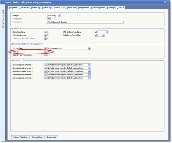 6. Tragen Sie im Feld BLOCK 1-5 die Ziffer des 5-zeiligen Übernahmeblocks ein, der auf diesem Beleg erscheinen soll, wenn ein anderer Beleg in diesen Beleg gewandelt wird.