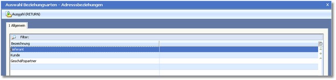 In dieses Feld können Sie eine Beziehungsart, z.B. "Lieferant", eingetragen. Wählen Sie mit [F5] aus der Auswahl Beziehungsart die gewünschte Beziehung aus und übernehmen Sie diese mit [RETURN] in das Feld.