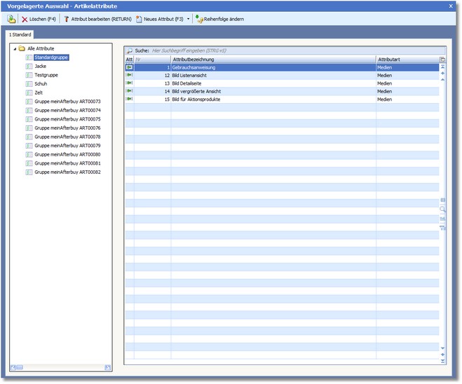 Jeder Artikel erhält automatisch alle Attribute aus der Standardgruppe, außerdem kann eine weitere Attributgruppe beim Artikel hinterlegt werden.