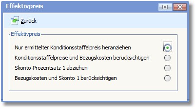 Für die Ermittlung des effektiven Einkaufspreises wird nur der ermittelte Staffelpreis der Kondition herangezogen.