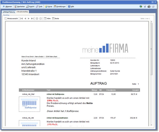 In der Karteikarte "Druckvorschau" wird der erstellte Beleg in einer Vorschau grafisch dargestellt. Sie können sich hier den zu druckenden Beleg anschauen.