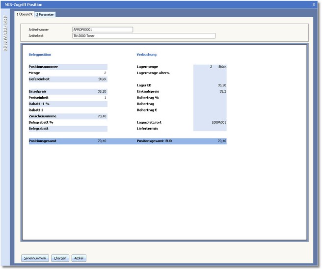 Dieser Button verzweigt in das MIS-Artikel der Position.