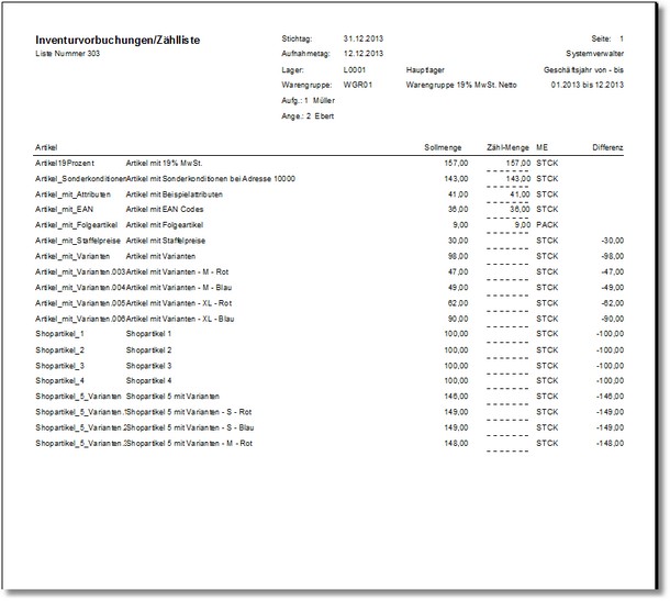Auf der Registerkarte 3, "Zählliste" sehen Sie die Artikel des Lagers jeweils mit ihrem Sollbestand, der Zählmenge, der Mengeneinheit und der Differenz zwischen Sollbestand und Zählmenge, soweit diese bereits ermittelt wurden.