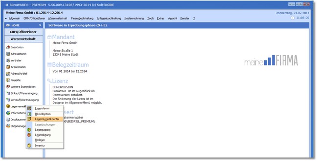 1. Klicken Sie mit der Maus im Arbeitsplatz der Warenwirtschaft auf "Lagerverwaltung > Lager/Logistikcenter".